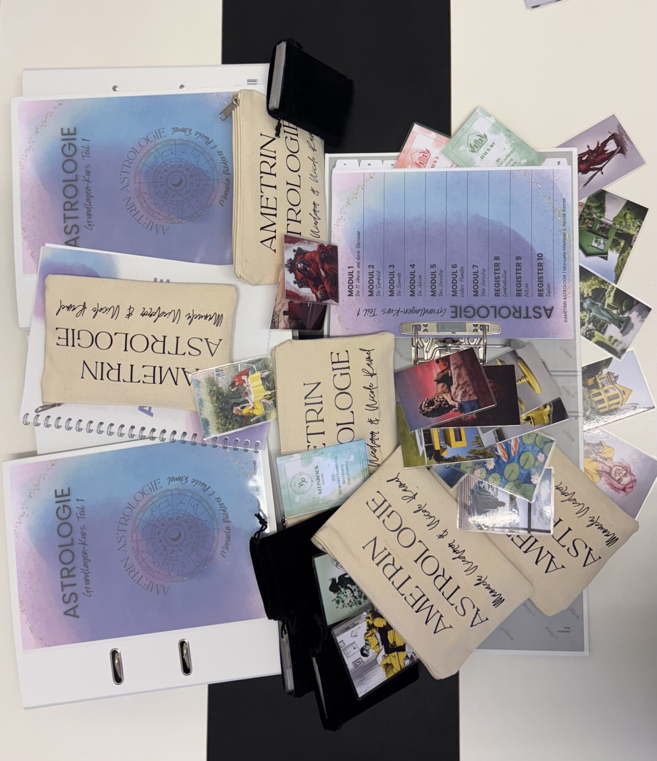 Während dem Kurs bekommst du deinen eigenen Ordner mit allen Unterlagen, ein persönliches Kartenset zum üben, 7 Module voller Wissen und eine Schritt für Schritt Anleitung für dein Horoskop, Zusätzlich 10 live Work-Shops in Oberentfelden inklusiv Snacks und Getränke.